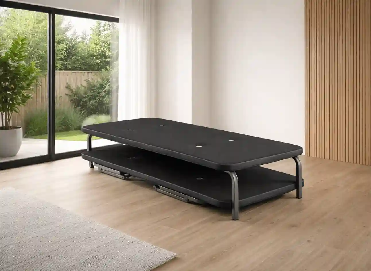 La Base Canguro es un sistema de descanso tapizado diseñado para optimizar el espacio sin renunciar a resistencia, ventilación ni estética. Permite disponer de dos camas completas en el lugar de una, manteniendo la base inferior totalmente recogida cuando no se utiliza.