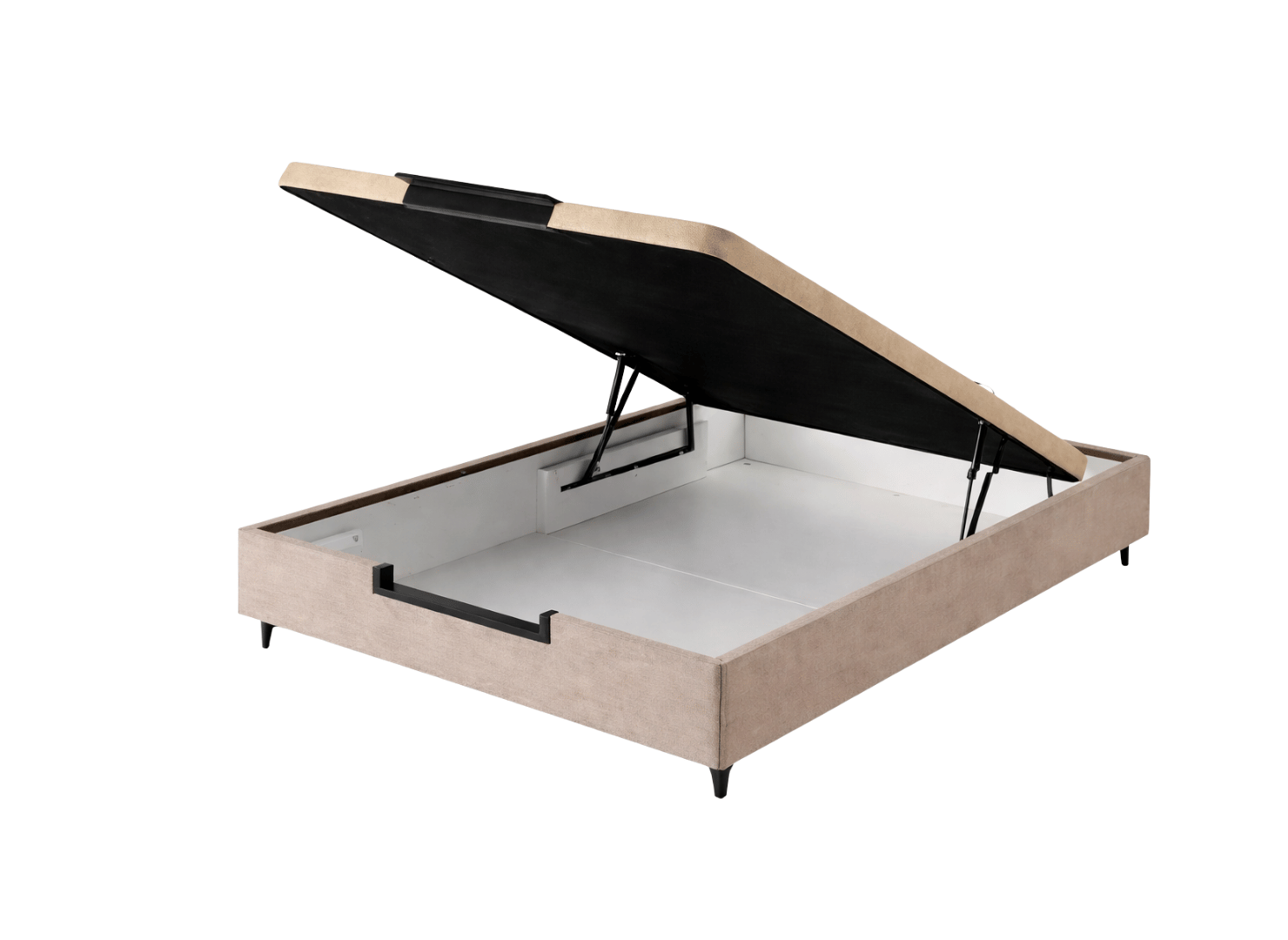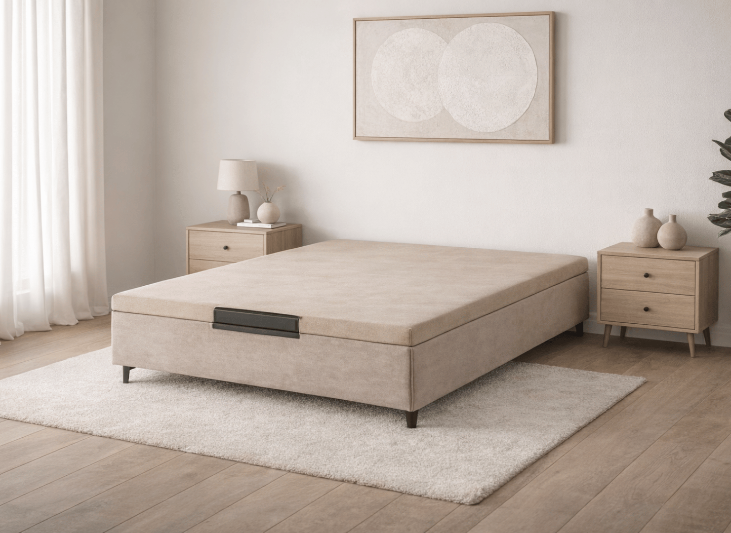 El Canapé Rin es una base tapizada con patas que combina ventilación, diseño moderno y almacenamiento práctico. Estructura reforzada de 35 mm, tapa 3D transpirable y apertura hidráulica silenciosa.