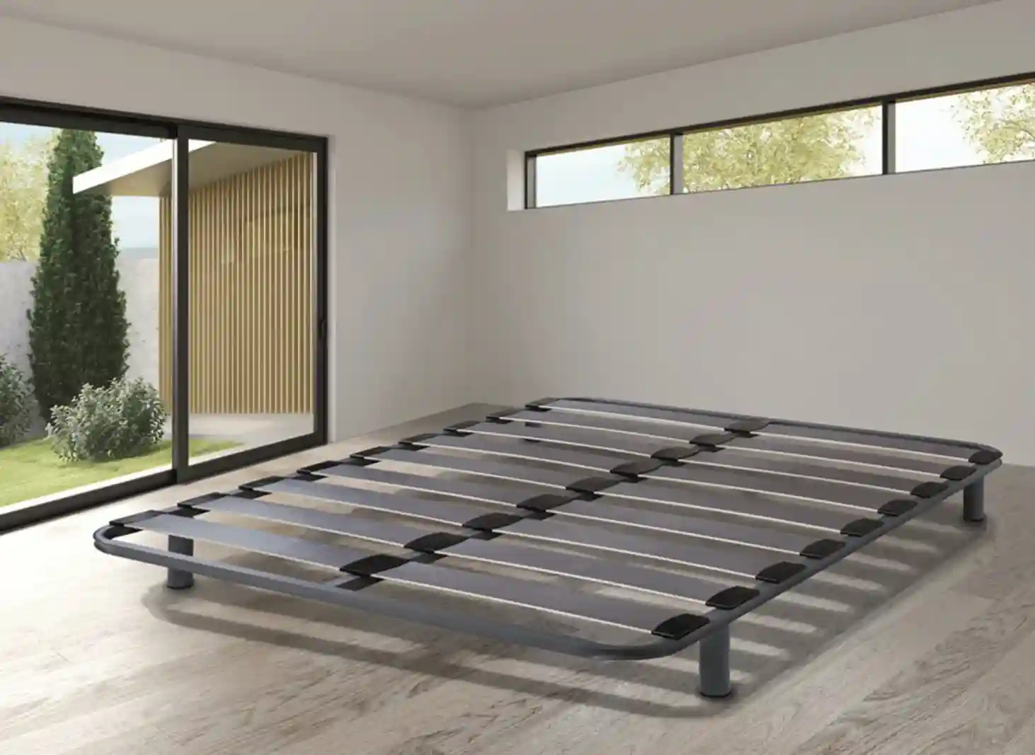 Somier Apolo Plus metálico reforzado 30×30 mm con cinco travesaños y láminas de haya vaporizada. Soporte firme, estable y silencioso.
