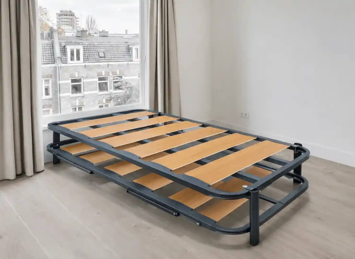 Somier Canguro Low con estructura metálica 40×30 mm en parte superior e inferior, reforzado con doble barra central y láminas de madera para ventilación óptima. Sistema cama nido resistente, estable y diseñado para optimizar el espacio sin renunciar a la durabilidad.